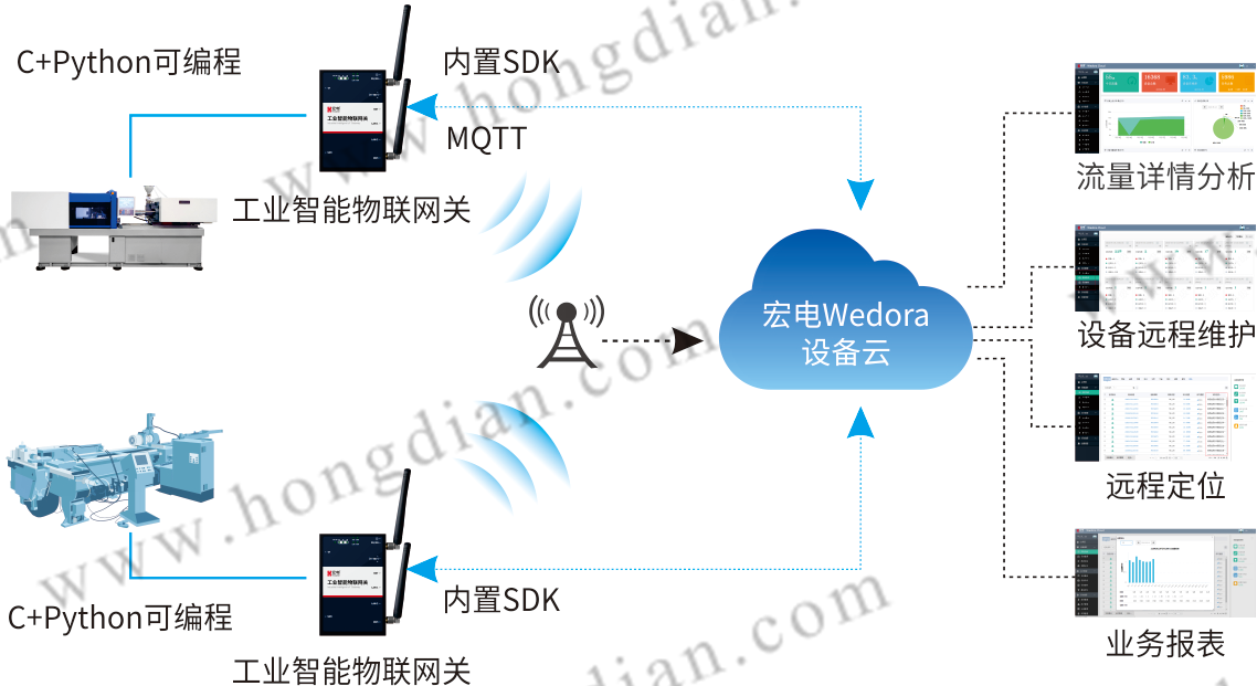 經過多次與數控機床廠家的交流,宏電認為首先需要解決設備聯網的網絡通道和網絡接入的問題,根據數控機床設備在全國、全球的點多分散及使用現場的環境,對數控機床CNC控制單元和測量數據單元的遠程診斷維護及數據監測,通過無線通信隨時通信、易部署特點,以邊緣計算網關—宏電工業智能物聯網關為載體建立機床設備之間互聯互通的通道,建立數控機床遠程智能監控系統,具體方案實施主要從以下幾個方面: