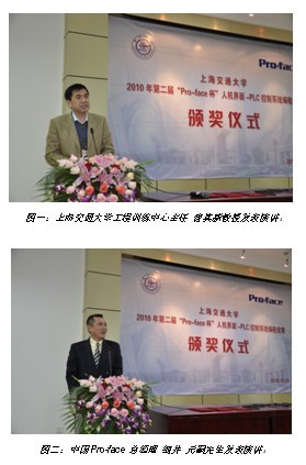 全球人機(jī)界面領(lǐng)導(dǎo)廠商Pro-face繼2009年與上海交通大學(xué)合作成立“上海交通大學(xué)-Pro-face人機(jī)界面與PLC可視化控制實(shí)驗(yàn)室”,并成功舉辦首屆“Pro-face杯”人機(jī)界面-PLC控制系統(tǒng)編程競(jìng)賽活動(dòng)之后。2010年雙方繼續(xù)深入合作,將先進(jìn)的人機(jī)界面技術(shù)和工業(yè)自動(dòng)化應(yīng)用在上海交通大學(xué)進(jìn)行實(shí)踐教育,在對(duì)學(xué)生進(jìn)行人機(jī)界面基礎(chǔ)知識(shí)和編程技能的集中培訓(xùn)后,2010年11月28日,在上海工程訓(xùn)練中心成功舉辦了2010年第二屆“Pro-face杯”人機(jī)界面-PLC控制系統(tǒng)編程競(jìng)賽。上海交通大學(xué)教務(wù)處副處長(zhǎng)高捷教授、工程訓(xùn)練中心主任曹其新教授及相關(guān)領(lǐng)導(dǎo)和中國(guó)Pro-face細(xì)井元嗣總經(jīng)理出席了競(jìng)賽頒獎(jiǎng)儀式,曹其新教授和細(xì)井元嗣總經(jīng)理分別代表上海交通學(xué)校和Pro-face發(fā)表了演講。