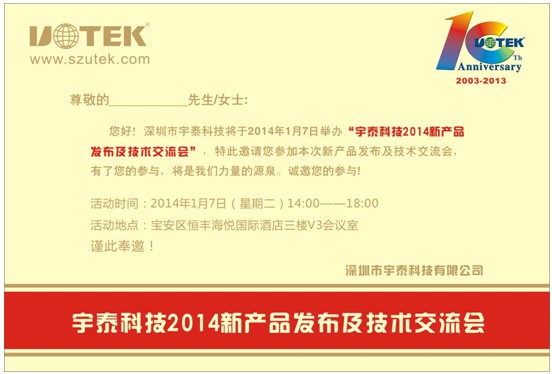您們好!為了讓更多的新老朋友們對(duì)宇泰科技有更深的了解,通過(guò)宇泰科技更直觀得了解到最新、最前沿的智能通訊產(chǎn)品及技術(shù)。由深圳市宇泰科技有限公司舉辦的“宇泰科技2014新產(chǎn)品發(fā)布及技術(shù)交流會(huì)”誠(chéng)邀您的參與!