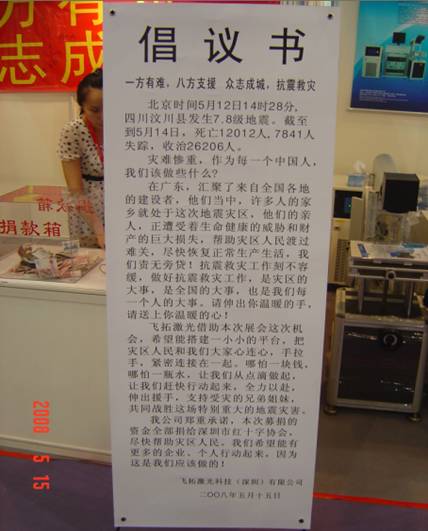 汶川大地震牽動著我們每個人的心,在第二屆亞洲(東莞)國際激光加工裝備展上有些展商(如飛拓激光科技(深圳)有限公司)自發性的在自己的展位上放幕捐箱,為災區人民盡自己的一份心,這一行為感動著現場每個人。觀眾在參觀的同時,紛紛向幕捐箱里投上自己的一份心意。