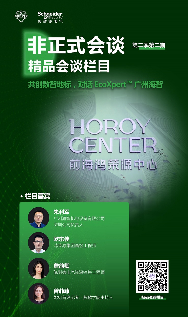 由全球能源管理與自動化領域的數字化轉型專家施耐德電氣打造的全新一季精品會談欄目“非正式會談”第二季正火熱播出,并于近日正式上線了第二期節目。在本期會談中,廣州海智機電設備有限公司(以下簡稱廣州海智)深圳公司負責人朱利軍及鴻榮源集團高級工程師歐東佳作為特邀嘉賓,與施耐德電氣資深銷售工程師詹韻卿一起,就EcoXpert™合作伙伴計劃的數字化賦能和深圳前海鴻榮源中心項目的建設展開深度討論,為觀眾帶來智能樓宇領域的前沿實踐經驗分享。