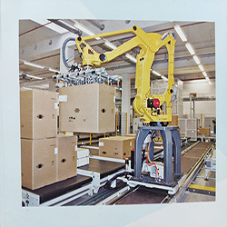 機器人自動抓取垛板倉里的垛板到一個指定位置,箱子被整列的從輸送線上抓取并放置到垛板上。通過旋轉吸盤實現層與層之間的壓箱,同時層與層之間的隔板也是機器人從隔板倉自動抓取