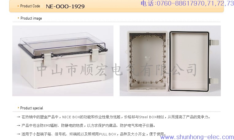 中山市順宏電氣有限公司 電話(TEL):0760-88617970,88617971,88617972,88617973 傳真(FAX):0760-88617979 手機(H.P):13925327188 聯系人:胡小姐,奚小姐,羅小姐 網 址:http://www.shunhong-elec.com 韓國DSE HIBOX海博密封控制箱/開關盒/接線盒 本公司代理韓國HIBOX(海博開關盒/接線盒)全系列產品,型號齊全,價格低:韓國DSE HIBOX海博接線盒,按扭盒,開關盒,控制箱,電控箱,密封箱,配電柜,配電箱,透明蓋開關盒。專業提供防護,防塵,防水,防腐接線盒,按扭盒,開關盒,控制箱,電控箱,電氣密封箱,電源配電柜,端子盒,接線盒,鋁合金開關盒,密封箱,配電柜,配電箱,防爆箱,防爆接線箱、控制按鈕,防爆接線盒,防爆控制箱,防爆密封箱,防爆配電箱柜,透明防爆箱,低壓配電柜(箱)照明箱\動力箱及各種自動化控制箱,低壓開關柜;按客戶要求生產各種非標電箱,箱式變電站,,接線箱,儀表箱,開關箱,插座箱,按鈕箱,插頭插座,防水接頭,防爆接頭等高防護產品。產品有超過20種系列,800多種不同的規格,3000多種型號,其材質有聚碳酸酯(PC)、ABS、玻璃纖維(GRP)增強聚酯和壓鑄鋁(AL)等,以及不銹鋼材質可供選者。產品擁有歐洲及北美的各類證書如:UL,KEMA,FIMKO,CE,CSA等多項第三方認證,防護等級達到IP65以上。廣泛適用于石油化工、污水處理、鋼鐵、軌道交通、通訊、軍工、航天、造紙、醫藥、食品、鋼鐵、汽車、機械設備等行業。防水接線盒,電氣密封箱,密封機箱擁有上千種型號可選,防塵、防水、防爆、耐酸、耐堿、外型美觀、品質穩定、完全絕緣不導電、抗撞擊不變形等特點.大大小小有上千種選擇。其主要應用:接線盒(箱)、控制箱、EMC屏蔽箱、轉接箱、拉線箱、分電箱、儀表箱、按鈕開關箱。.....歡迎來電咨詢。HIBOX代理商-中山市順宏電氣有限公司 TEL:0760-88617970,88617971,88617972,88617973,13925327188 FAX:0760-88617979 詳情請登錄本公司網站:http://www.shunhong-elec.com 韓國DSE HIBOX防水開關箱,接線盒(采用ABS、PC、Polyester、AC、UV和耐火材料等材料制成。產品中包含防EMI輻射、防靜電的物質。防水防塵,防護等級IP66,抗沖擊IK08。獲得德國VDE和TUV標志、歐共體CE標志和美國UL標志。廣泛用于電子電氣,通信,消防設備,控制配電盤,端子箱,PCB BOX,船舶,石油化工,大型工廠,沿海工廠,碼頭,水處理設施,環保設備等);