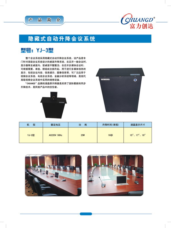 液晶屏升降器用于高級多媒體會議系統,監控系統,軍事指揮中心,教育多媒體中心,高級辦公系統,辦公家具等。需要使用顯示屏時,隱藏在會議桌內部的升降機把顯示屏從底部升到桌子表面;當不使用顯示屏時,升降機自動下降,顯示屏隱藏在會議桌內部,防盜,防塵,保持桌子表面的平整和美觀。 產品特點: 1、適用于15,17,19寸的液晶顯示器,由先進的螺紋 升降原理,升降快速平穩,靜音無噪。 2、選用靜音電機.穩定性強.抗震性好.無噪音.3、自動開合裝飾板.具有豐富的接口端子 4、單機使用和通過中控實現集合控制 5、支持無線網絡控制RS232,RS485
