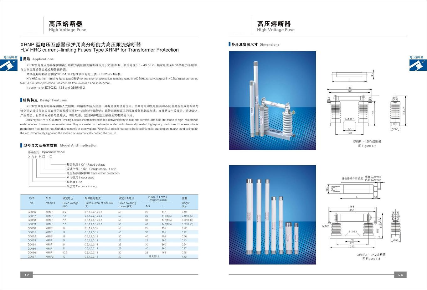 XRNP型電壓互感器保護(hù)用高分段能力高壓限流熔斷器適用于交流50Hz,額定電壓3.6~40.5KV,額定電流至6.3A的電力系統(tǒng)中,作為電壓互感器過載或短路保護(hù),符合國家GB15166.2標(biāo)準(zhǔn)和國際電工委IEC60282-1標(biāo)準(zhǔn)。聯(lián)系電話029-84258797  18966700156