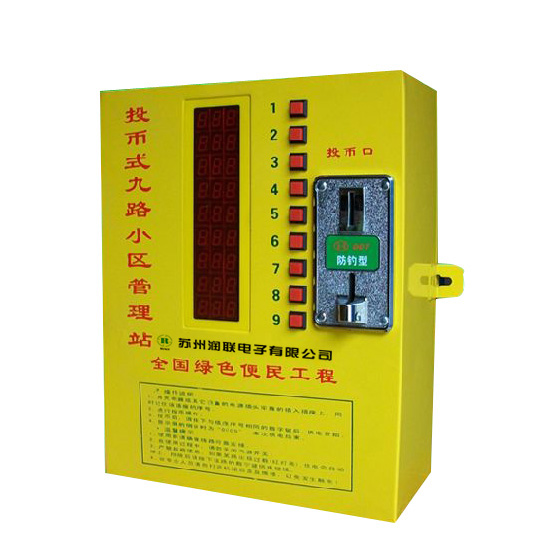 產品由一臺控制器外加十個兩孔84插座構成,控制器內裝有電表及空氣開關,主機具有錢幣識別功能,識別率可達到99.7%。出廠設置只識別錢幣(也能根據客戶需要定制可使用代用幣的機型)。并且控制器有九、十路供電通道,每路通道都有其獨立的顯示窗口與控制按鍵,用戶在投幣(或刷卡)后,按下其中的一個控制按鍵,控制器就會給對應通道的插座供電,各通道的工作狀態與工作時間,可以通過其對應的顯示窗口顯示出來。考慮為適應不同型號的電動車,控制器輸出的是220V電源,給電動車充電時還是需要插接上電動車自帶的充電器。
