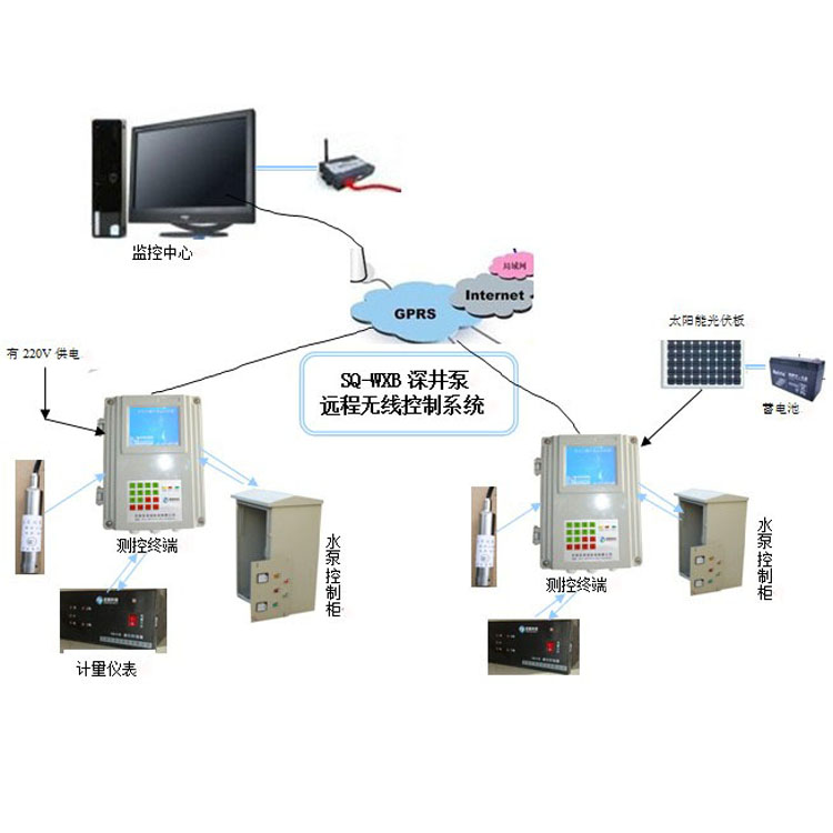 SQ-WXB深井泵水泵遠程無線控制系統主要包括工控機、系統監控軟件、網絡接入設備;數據采集模塊、電磁流量計、壓力變送器、液位傳感器、電磁閥、測控儀表、數據接發儀、避雷器、電源控制器、繼電器單元、配電控制機柜及安裝附件組成。