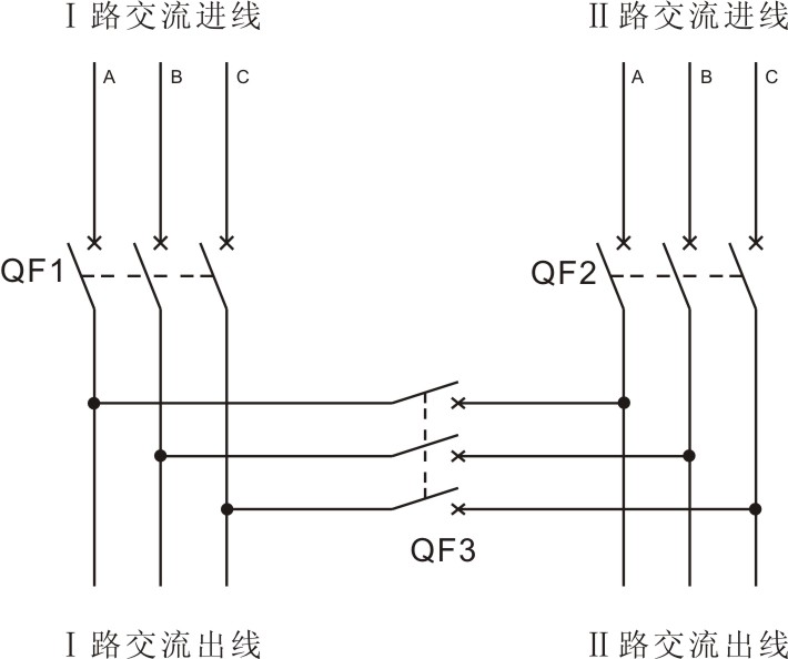 (2) 給一路三相交流輸入送電,二路交流輸入不送電,自動/手動置于自動狀態(自投自復), 斷路器QF1延時閉合,母聯斷路器QF3 在斷路器QF1閉合后延時閉合,則兩路用電均由一路