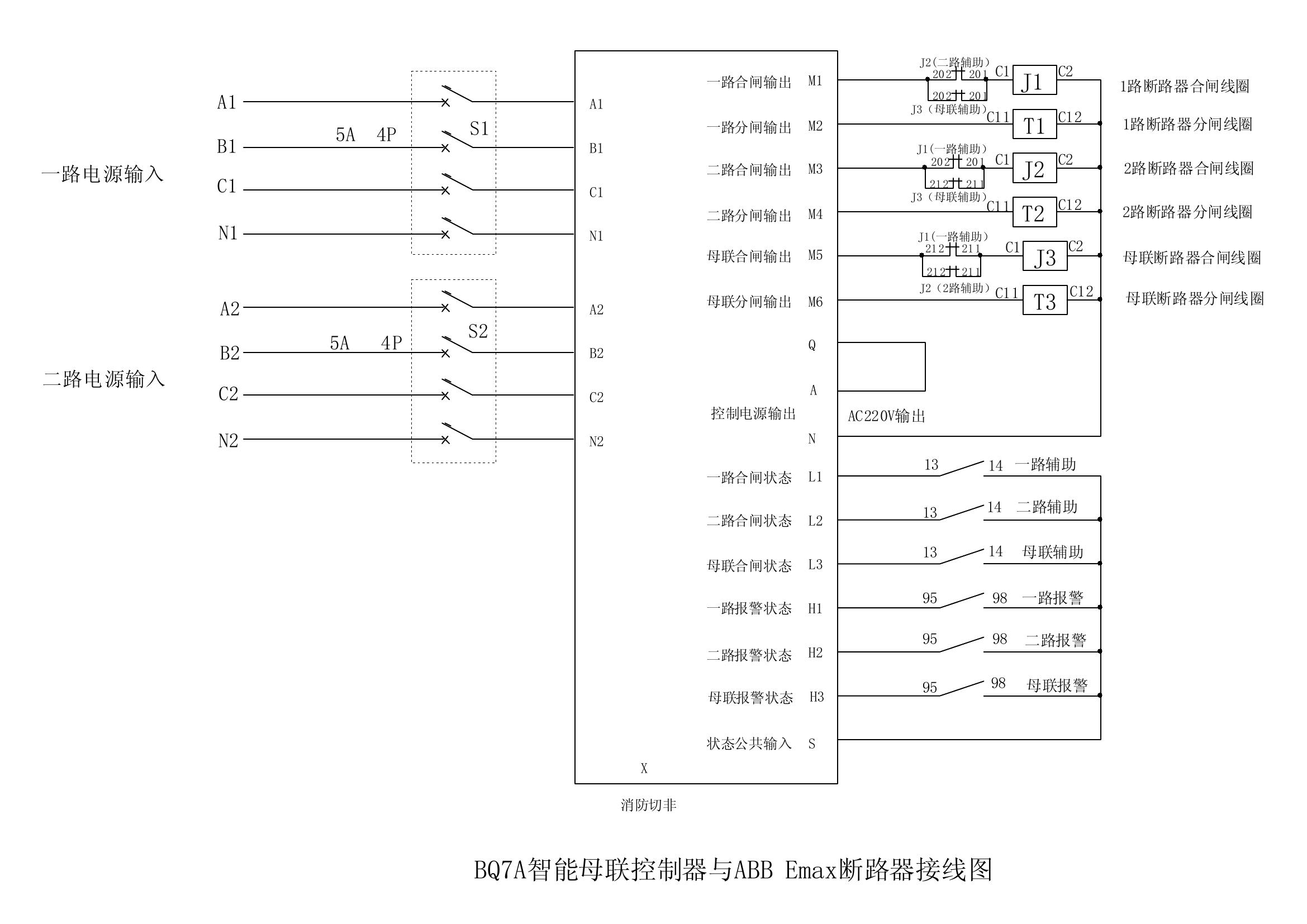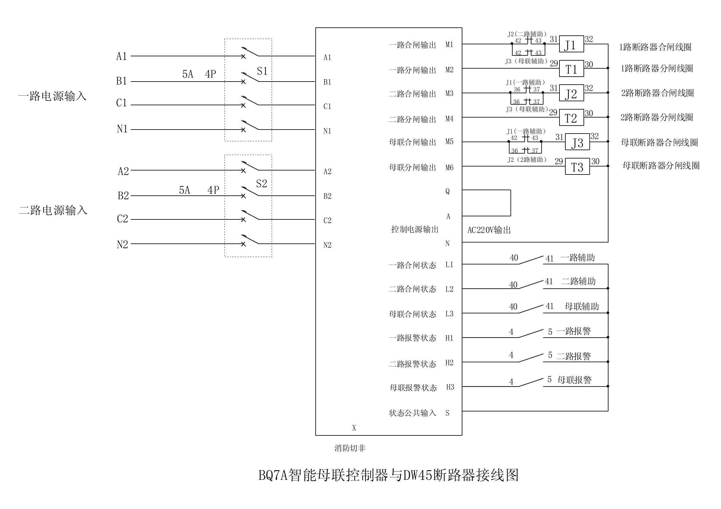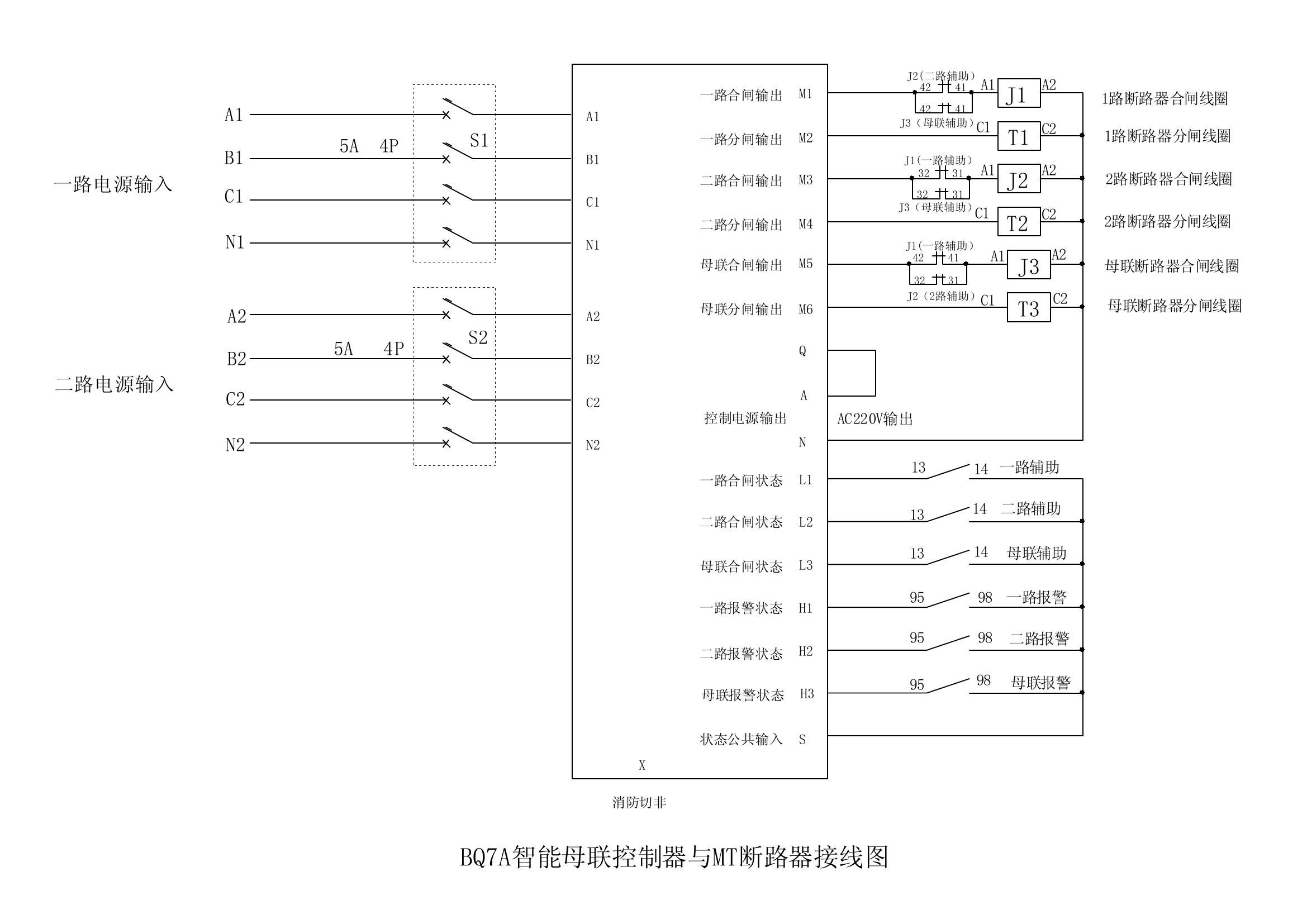 BQ7A母聯制器的執行部件是框架式空氣斷路器或塑殼斷路器,不需要外接三相過欠壓保護器,不需要加裝適配器,控制器不需要外接控制電源及直流電源,直接對三臺斷路器及電源狀態進行檢測,自動控制完成斷路器的轉換。