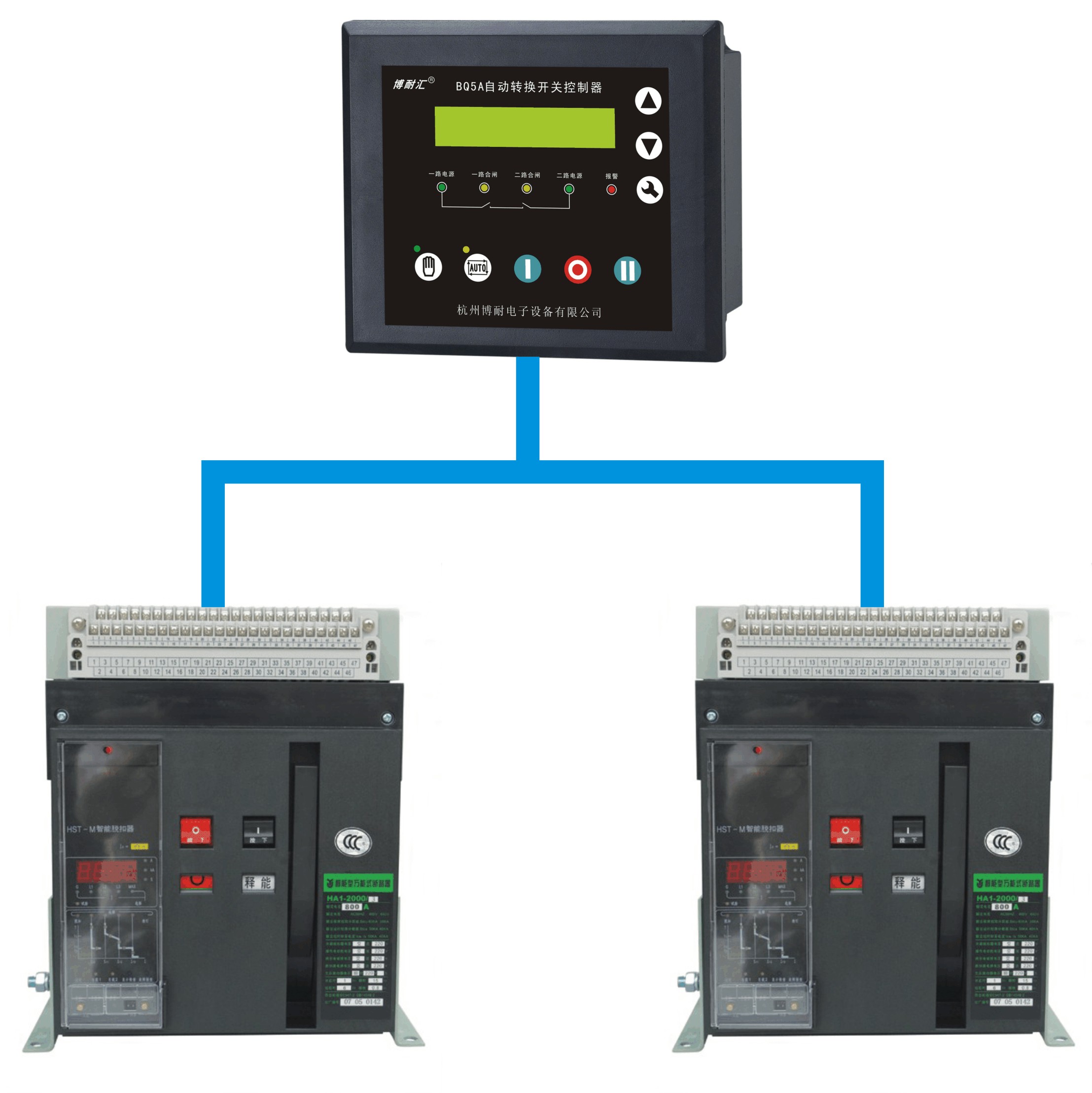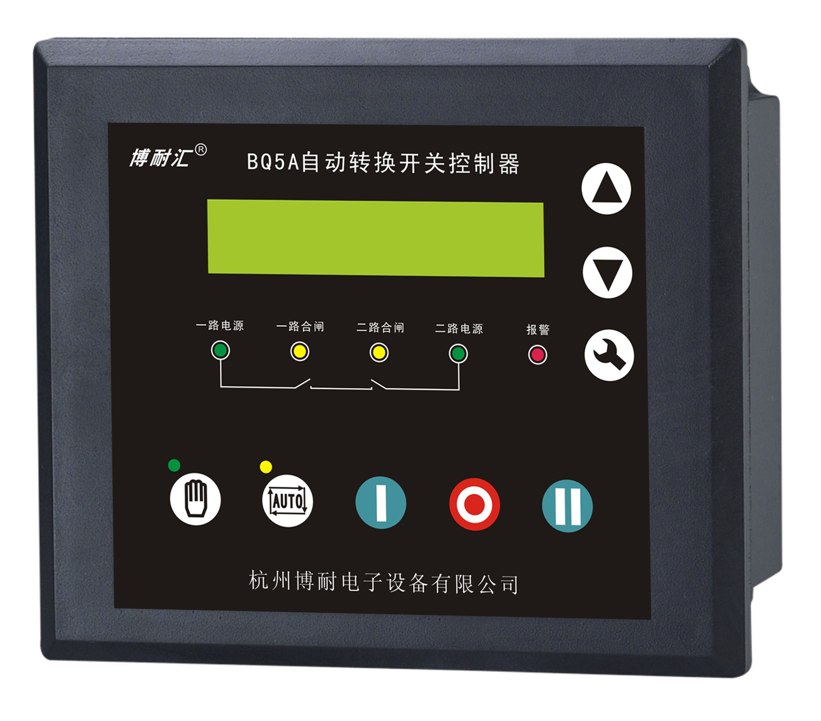 BQ5A自動(dòng)轉(zhuǎn)換開關(guān)控制器是一種自動(dòng)化測量、LCD顯示為一體的智能雙電源切換系統(tǒng)。是雙電源切換的理想產(chǎn)品,在與低壓空氣斷路器配套使用后,特別適合于兩路低壓進(jìn)線側(cè)的自動(dòng)轉(zhuǎn)換和保護(hù)。 BQ5A自動(dòng)轉(zhuǎn)換開關(guān)控制器的執(zhí)行部件是框架式空氣斷路器,兩臺(tái)斷路器不用加裝適配器,也可以不需要欠壓脫扣器,控制器不需要外接直流電源,直接對(duì)兩路供電狀態(tài)進(jìn)行檢測,自動(dòng)控制完成常用電源與備用電源的轉(zhuǎn)換。 產(chǎn)品具有結(jié)構(gòu)緊湊、電路先進(jìn)、接線簡單,可靠性高,可廣泛應(yīng)用于電力、石油、化工、煤炭、冶金、鐵道、市政、智能大廈等行業(yè)、部門的電氣裝置、自動(dòng)控制以及調(diào)試系統(tǒng)。 產(chǎn)品特點(diǎn) 1.用于兩路市電、或一路市電一路發(fā)電自動(dòng)切換,尤其適合兩路低壓空氣斷路器的切換; 2.時(shí)刻監(jiān)視兩路三相電壓,對(duì)出現(xiàn)的電壓異常(如失壓、過壓、 欠 壓、缺相)做出準(zhǔn)確的判斷并輸出控制開關(guān)量; 3.設(shè)有自動(dòng)/手動(dòng)狀態(tài)切換功能,在手動(dòng)方式下,可按手動(dòng)鍵實(shí)現(xiàn)開關(guān)分合閘;自動(dòng)狀態(tài)下,任一路出現(xiàn)電壓異常時(shí),開關(guān)自動(dòng)切換到另一路; 4.運(yùn)行模式可設(shè)定為一路優(yōu)先、二路優(yōu)先或無優(yōu)先(互為備用); 5.?dāng)?shù)字顯示兩路相電壓及線電壓,LED顯示兩路合閘及工作狀態(tài); 6.可在控制器上更改各參數(shù),均采用數(shù)字化調(diào)整(連續(xù)可調(diào));同時(shí)記憶在內(nèi)部FLASH 存儲(chǔ)器內(nèi),在系統(tǒng)掉電時(shí)也不會(huì)丟失; 7.具有自動(dòng)啟動(dòng)油機(jī)功能;控制器不需要外接直流供電電源,簡單方便; 8.具有極強(qiáng)的抗電磁干擾能力,適合在強(qiáng)電磁干擾的復(fù)雜環(huán)境中使用; 9.控制器可與任何低壓空氣斷路器配套,如DW45、DW17、DW15、ABB Emax、MT、3WL等。 10.模塊化結(jié)構(gòu)設(shè)計(jì),阻燃ABS塑料外殼,嵌入式安裝方式,插拔式接線端子,結(jié)構(gòu)緊湊,安裝維護(hù)十分方便。 使用方法