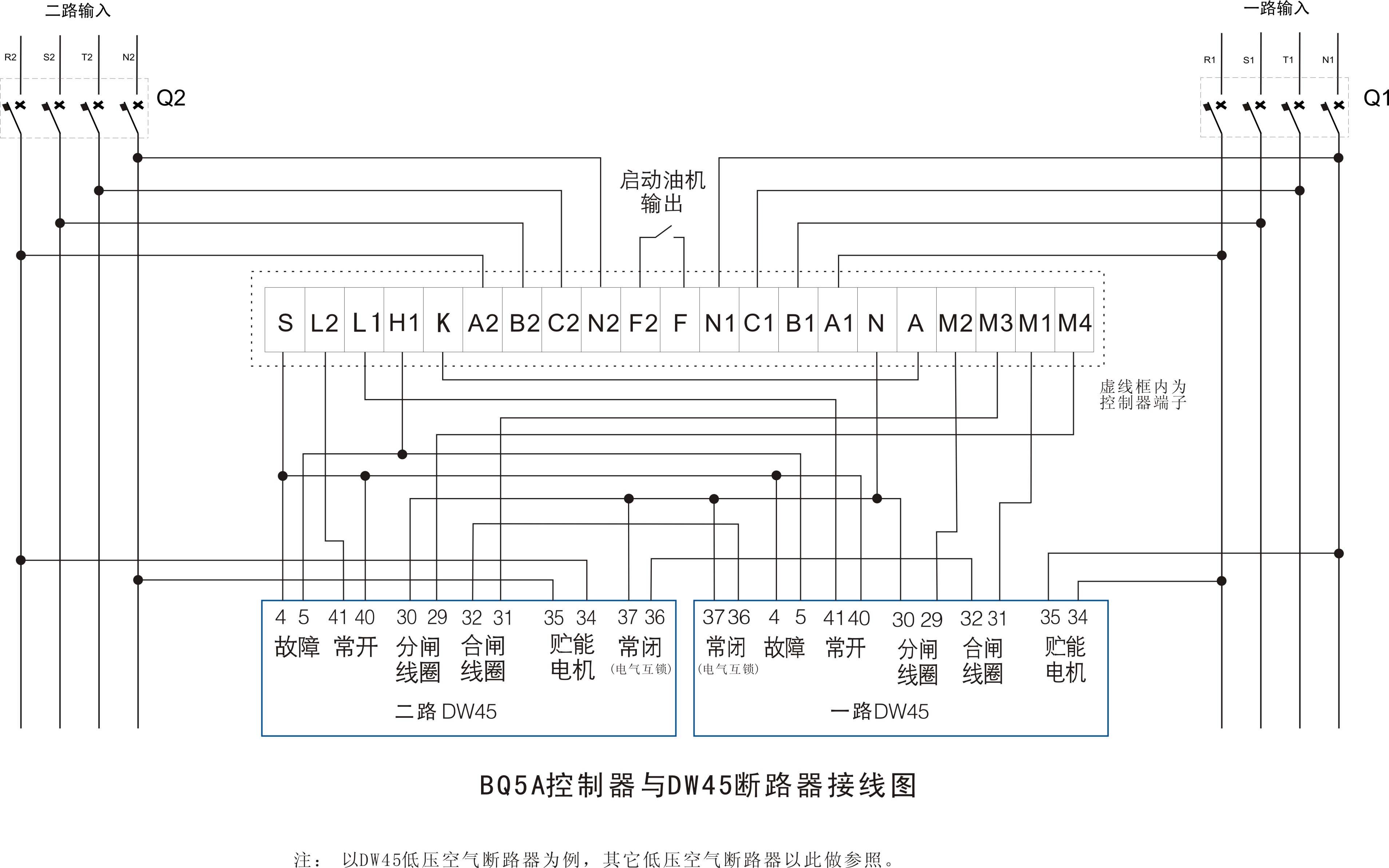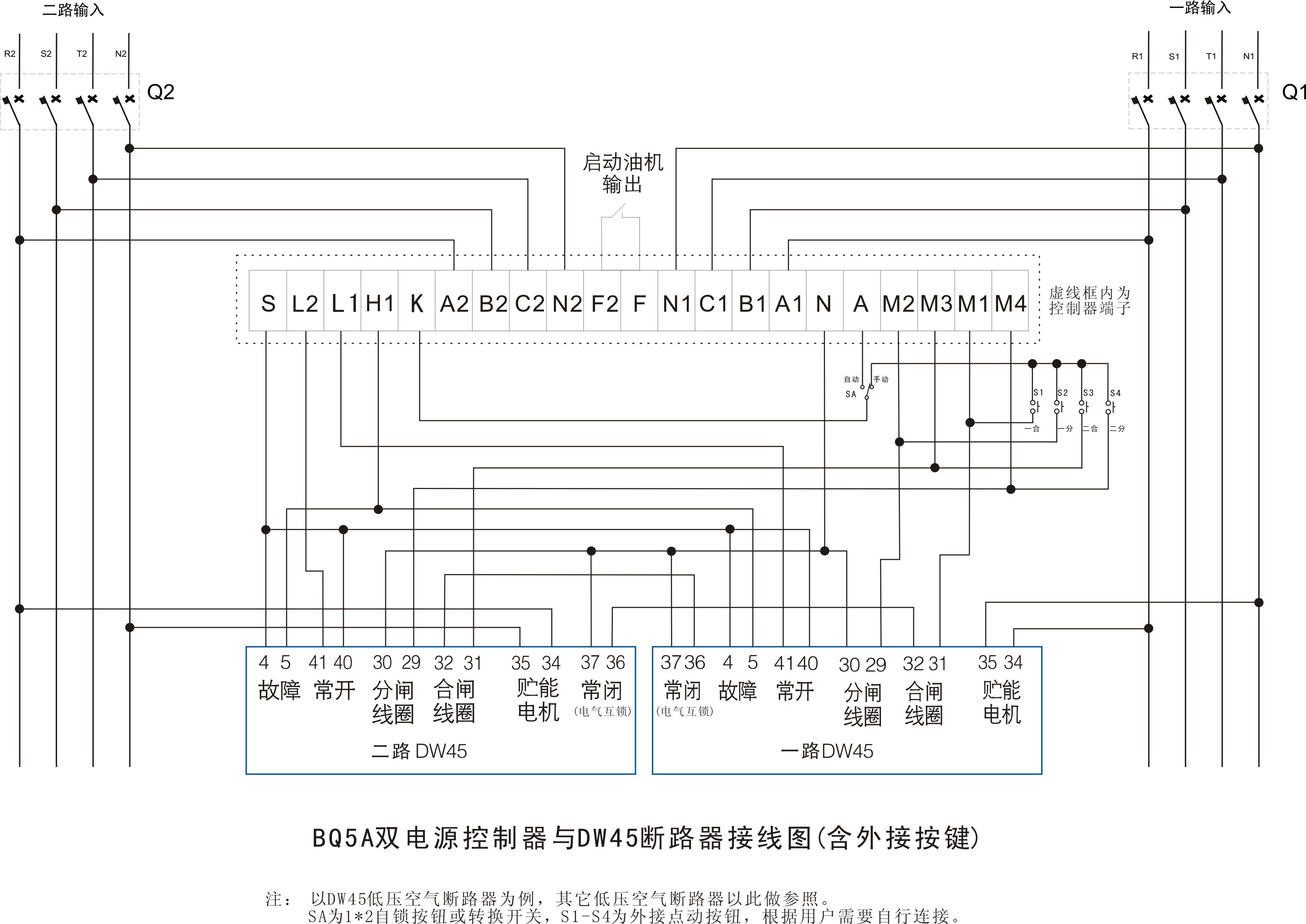 工作條件 1:由于各種低壓空氣式斷路器型號(hào)眾多,我們選取其中幾個(gè)有代表性的:國產(chǎn)DW45;ABB EMAX ;施耐德MT20;其它型號(hào)以此做參照。 2:為了雙電源的正常工作,低壓空氣式斷路器接入時(shí)必須安裝一些附件: 如合閘電磁鐵,分勵(lì)脫扣器。 3:雖然沒有機(jī)械聯(lián)鎖有電氣聯(lián)鎖也可工作,但是為了產(chǎn)品的安全可靠運(yùn)行,建議加裝機(jī)械聯(lián)鎖,使產(chǎn)品實(shí)現(xiàn)雙重保護(hù)尤為必要。 4:產(chǎn)品出廠前已經(jīng)過嚴(yán)格測試,錯(cuò)誤的接線及測試試驗(yàn)將會(huì)對(duì)控制器造成損壞。