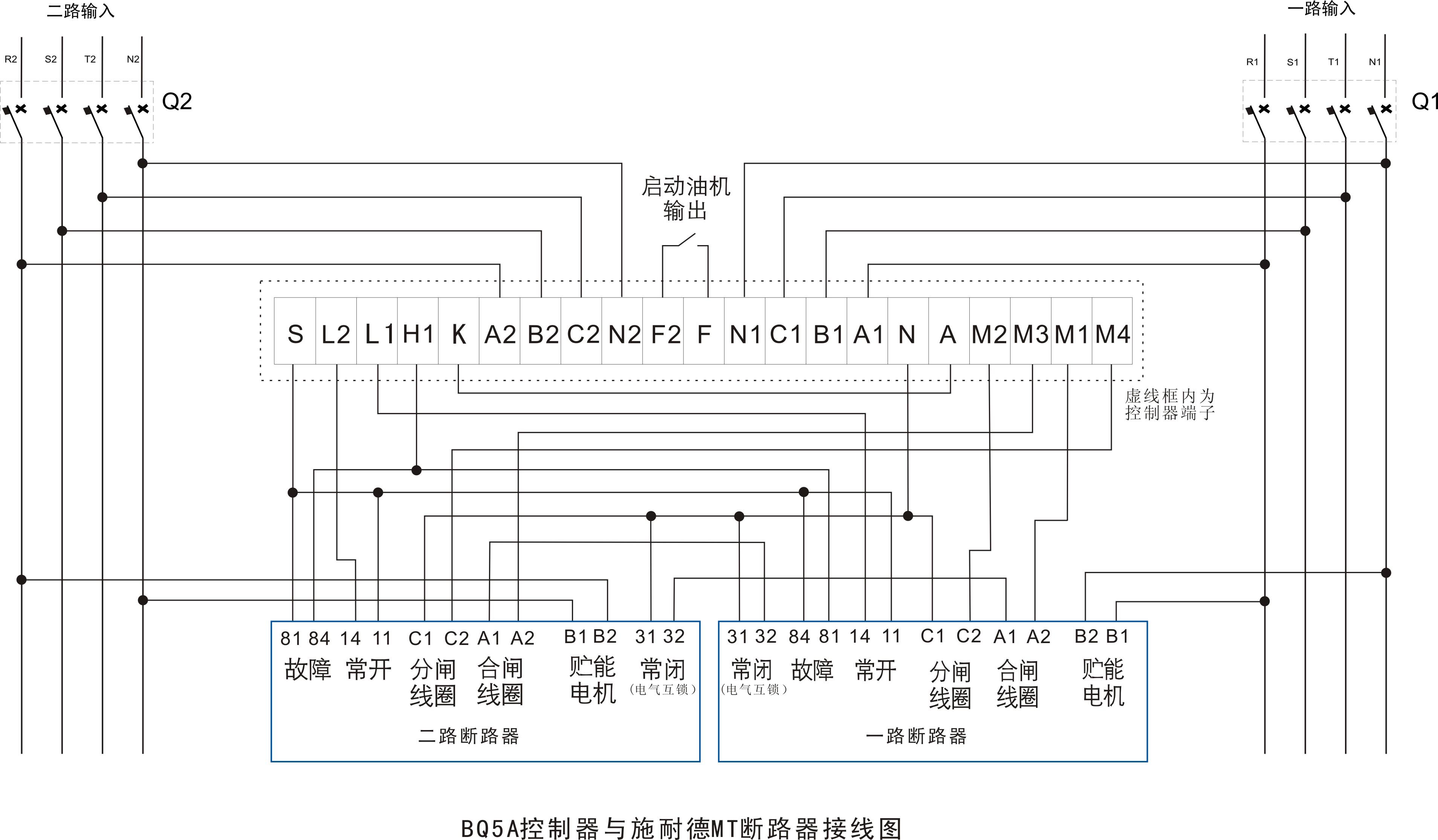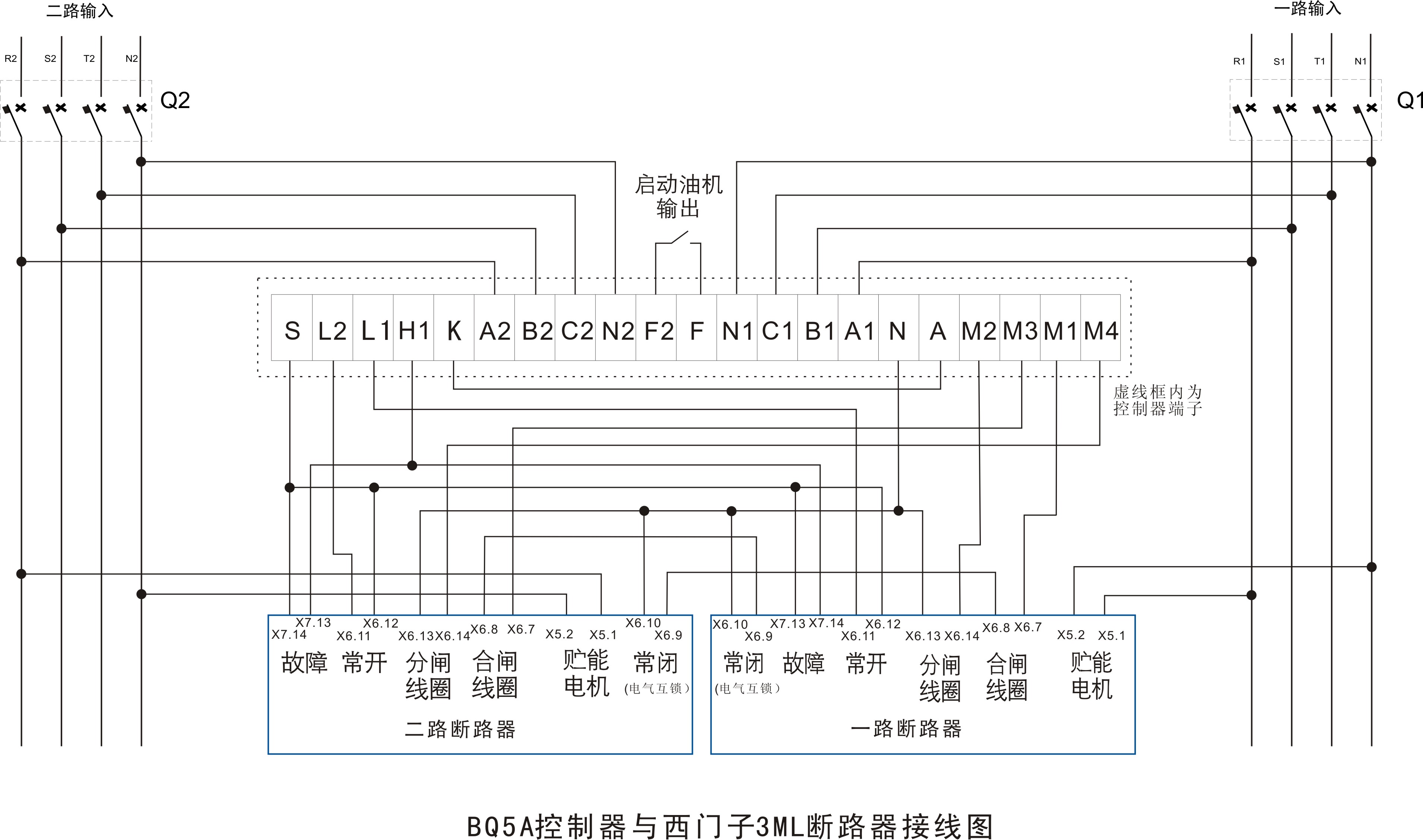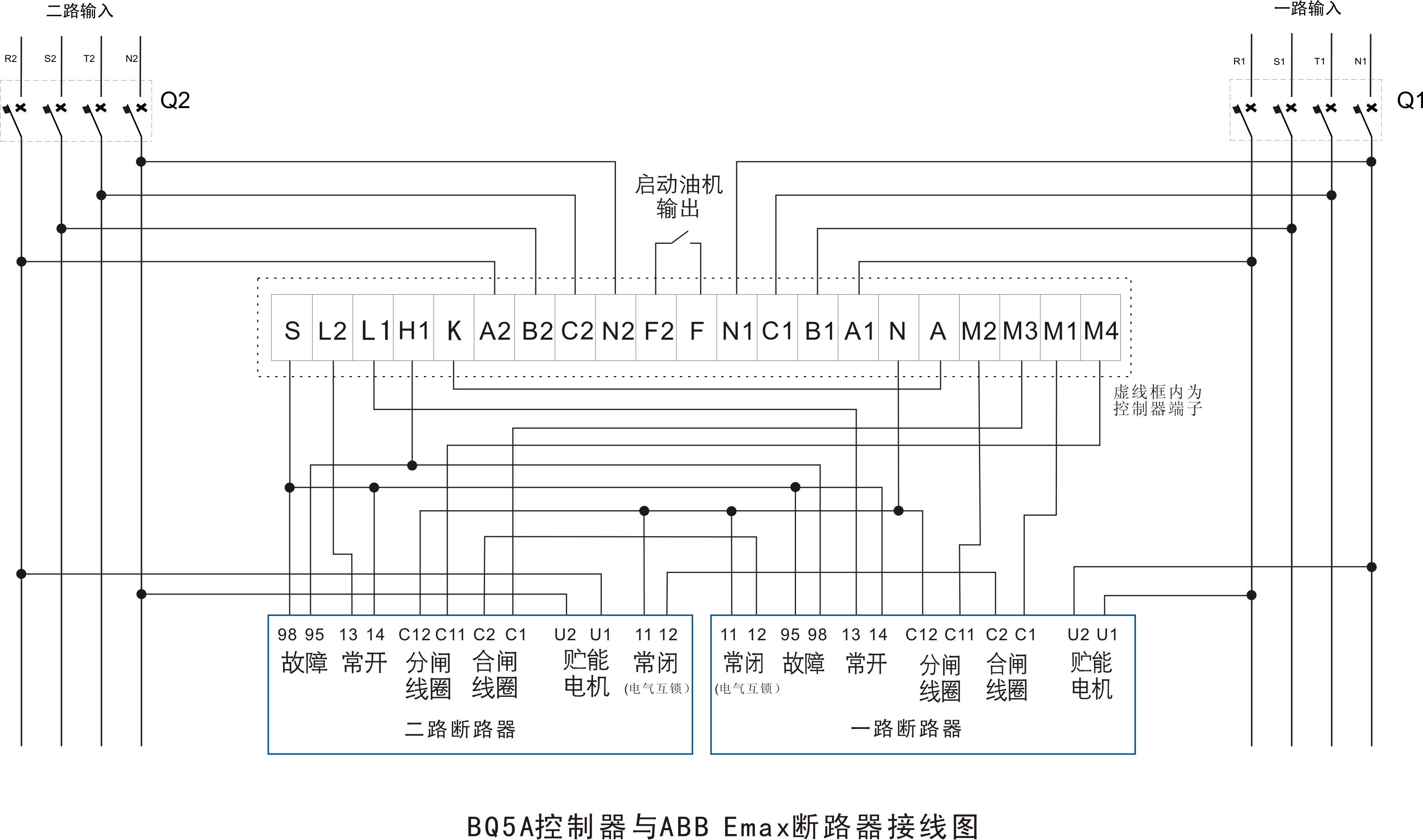 1.電源: 交流輸入:取自一二路A、N相電壓,只要其中一路有電,即可工作,單相電壓>170V。(該系統(tǒng)要求接N) 交流輸入電壓范圍:0-279V(單相)╱0-482V(三相)50Hz 輸入三相電流:0-5A(額定) 2.繼電器輸出容量:10A 220VAC 3.控制器接線端子說明 A1,B1,C1,N1:接一路電源 A2,B2,C2,N2:接二路電源 K,N:控制器輸出電源,以上兩路電源只要任何一路有電源輸入,K、N就有AC220V電源輸出 A:控制器M1、M2、M3、M4內(nèi)部無源公共接點(diǎn),一般接K M1:一路合閘輸出 M2:一路分閘輸出 M3:二路合閘輸出 M4:二路分閘輸出 S:一二路斷路器輔助及報(bào)警公共接點(diǎn) L1:控制器一路合閘指示,接一路斷路器輔助常開 L2:控制器二路合閘指示,接二路斷路器輔助常開 H1:控制器兩路報(bào)警指示,接一路和二路斷路器報(bào)警常開 F,F(xiàn)2:油機(jī)啟動(dòng)輸出接點(diǎn),一路電源不正常時(shí),會(huì)自動(dòng)輸出啟動(dòng)信號(hào)