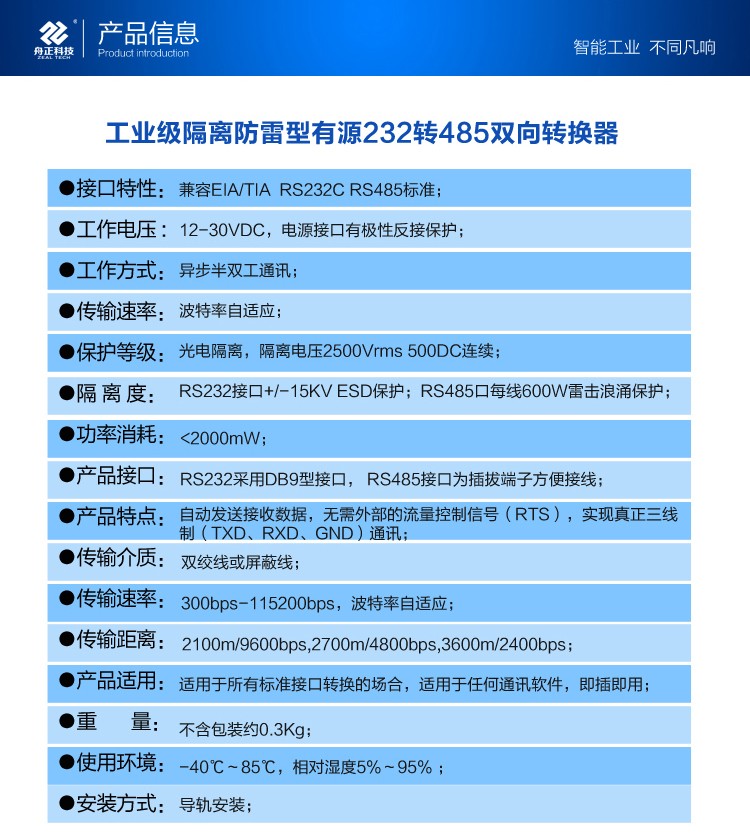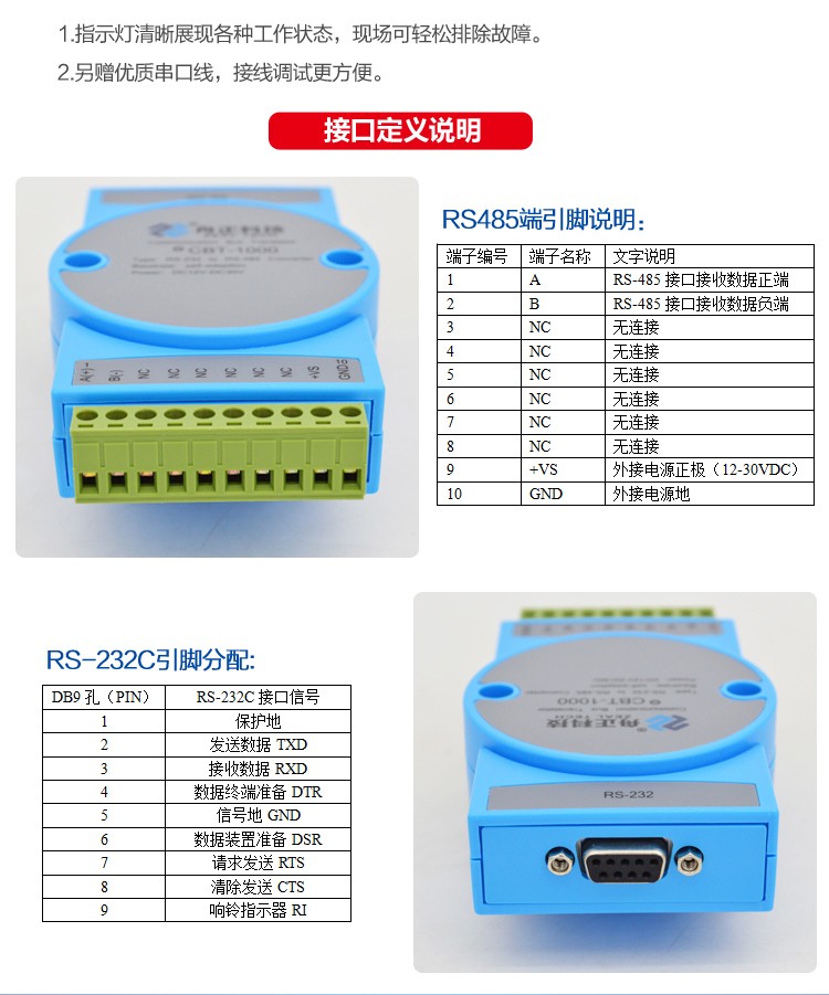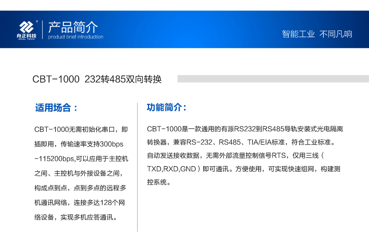 CBT-1000是一款通用的有源RS232RS485導軌安裝式光電隔離轉換器,兼容RS232RS485/TIA/EIA標準,符合工業標準。自動發送接收數據,無需外部流量控制信號RTS,僅用三線(TXDRXDGND)即可通訊。方便使用,可實現快速組網,構建測控系統。