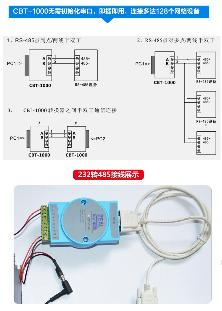 CBT-1000無需初始化串口,即插即用,傳輸速率支持300bps-115200bps,可以應用于主控機之間、主控機與外界設備之間,構成點到點,點到多點的遠程多機通訊網絡,連接多達128個網絡設備,實現多機應答通訊。