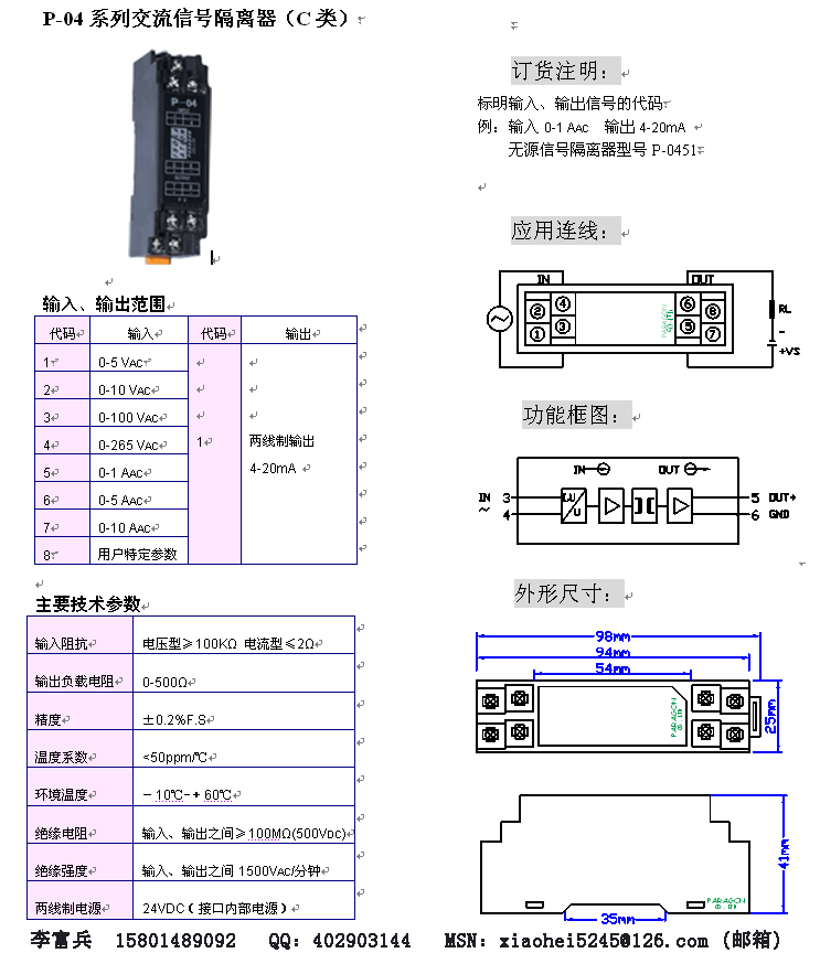 P-04系列交流信號隔離器(一入一出) 帕羅肯科技有限公司