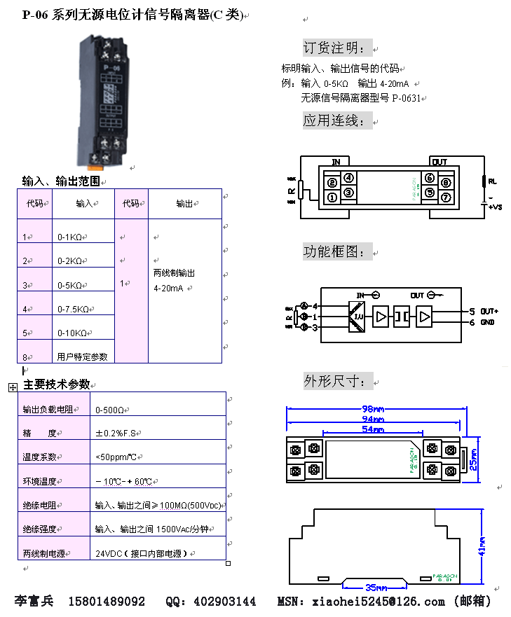 P-06系列無(wú)源電位計(jì)信號(hào)隔離器(一入一出) 帕羅肯科技有限公司