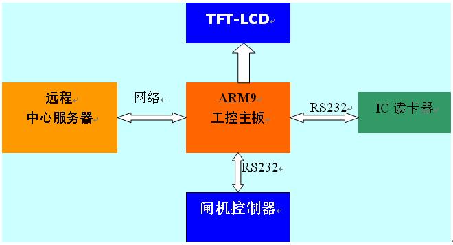 本系統(tǒng)采用一個(gè)RS232口讀取讀卡器的刷卡數(shù)據(jù),另一個(gè)232串口實(shí)時(shí)控制閘機(jī)進(jìn)行放行,通過TFT-LCD顯示扣費(fèi)等相關(guān)信息,將交易數(shù)據(jù)保存于本地存儲(chǔ)設(shè)備中,并可實(shí)時(shí)通過以太網(wǎng)傳輸?shù)竭h(yuǎn)程數(shù)據(jù)中心,保存到中心數(shù)據(jù)庫中。