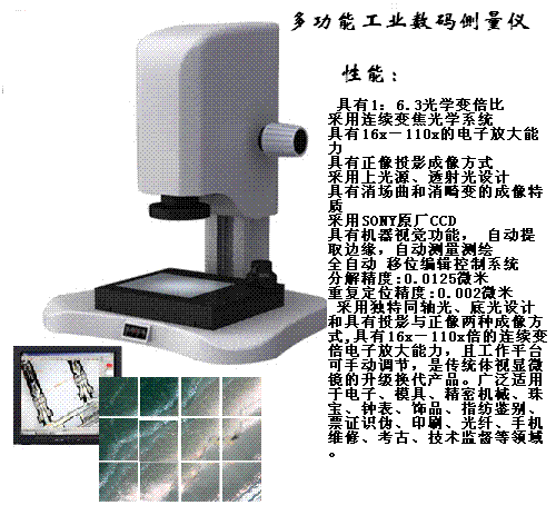是以現(xiàn)代光學為基礎,運用數(shù)字圖像處理、計算機通信和機器視覺系統(tǒng)為一體的現(xiàn)代視覺系統(tǒng)的綜合運用。視覺測量 視覺檢測 視覺定位 視覺分析 集合了數(shù)字科技成果與計算機屏幕測量技術的數(shù)碼投影測量系統(tǒng),它應用了獨有的雙向同步倍率校正技術(專利),采用獨特同軸光、底光、側光設計和具有投影與正像兩種成像方式,測量精度為±2um,分辨率0.001mm.能夠有效的解決了電子產(chǎn)品的誤差和屏幕的局限和滿足各種倍率的要求。產(chǎn)品是針對精密電子產(chǎn)品檢測制造業(yè)日益精湛的加工工藝所帶來的精確需求開發(fā)而成。MTC280系列機器視覺系統(tǒng)是機器視覺檢測、測量. 識別、定位.與嵌入式ARM等高技術軟件開發(fā),目前已廣泛應用于裝備制造、工業(yè)部件檢測、包裝檢測、印刷檢測、工業(yè)測量、劃痕(工損檢測)設備運動識別、定位等領域。提供實用、先進的解決方案服務于相關行業(yè)的開拓者!凹夹g創(chuàng)新與企業(yè)實際需求相結合”是產(chǎn)品開發(fā)的主導思想,也是我們提供產(chǎn)品和服務的指導思想。 MTC280系列機器視覺系統(tǒng)為解決現(xiàn)代工業(yè)產(chǎn)品生產(chǎn)過程中涉及的各種各樣的檢查、測量和識別、定位等問題推出的一套機器視覺系統(tǒng)解決方案。 適用于大批量生產(chǎn)過程中的質量檢查,如:零件裝配完整性,裝配尺寸精度,零件加工精度,位置/角度測量,零件識別,特性/字符識別等。 應用行業(yè):汽車,制藥,電子與電氣,制造,包裝/食品/飲料,醫(yī)學等。如對汽車儀表盤加工精度的檢查,高速貼片機上對電子元件的快速定位,對管腳數(shù)目的檢查,對IC表面印字符的辨識,膠囊生產(chǎn)中對膠囊壁厚和外觀缺陷的檢查,軸承生產(chǎn)中對滾珠數(shù)量和破損情況的檢查,食品包裝上面對生產(chǎn)日期的辨識,對標簽貼放位置的檢查。二、視覺系統(tǒng)特性: 1、 獨立的高速處理器,保障在線檢測速度要求 2、 嵌入式軟、硬件結構、保證系統(tǒng)高穩(wěn)定性和可靠性 3、能方便的與生產(chǎn)線設備連接/應用 4、 系統(tǒng)操作簡單、方便5、 提供多種視頻圖像輸入輸出、I/O控制、通訊等接口 6、 豐富的TCP/IP控制命令 7. 擁有光學強大的檢測功能 強大的信息采集和信息共享功能 8.尺寸測量.CNC走位自動測量 9.自動學習批量測量檢測定位等.10.CNC掃描批量測量檢測定位等11.自動對焦輔助測高,12影像地圖全屏牽引,13.鷹眼縮放精確回位,14SPC報告超標報警; CAD逆向測繪15. CNC快速測量檢測定位等,16.空間坐標旋轉,17.內(nèi)置 SPC 功能,18實時修正誤差 ,19定位識別 /信息采集對比等功能20.統(tǒng)計分析.21.信息采集導入CAD導出軌跡功能,測精度為±2um。信息采集1秒/4-10次.誤查精度±2um,取像時間/運算時間250-100毫秒/視野250FOV/秒