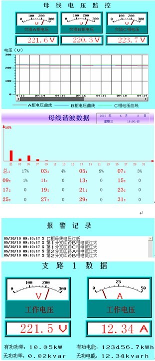 主要檢測數據對象有母線電流、電壓、功率、電能、母線諧波數據,各個支路電壓、電流、功率、電能,及各個支路的分合狀態。顯示以數字顯示、折線圖、條形圖為主,見圖3。