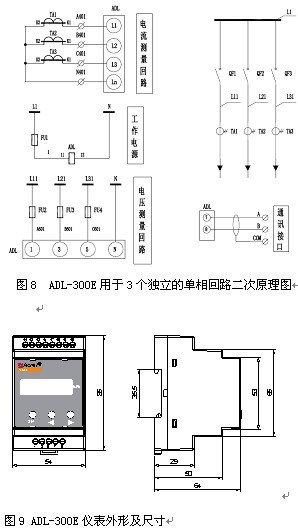 用于3個獨立的單相回路二次原理見圖8,ADL-300E支持0.05A電流信號接入,電流互感器二次側不允許接地。安裝結構為DIN35mm導軌,見圖9。
