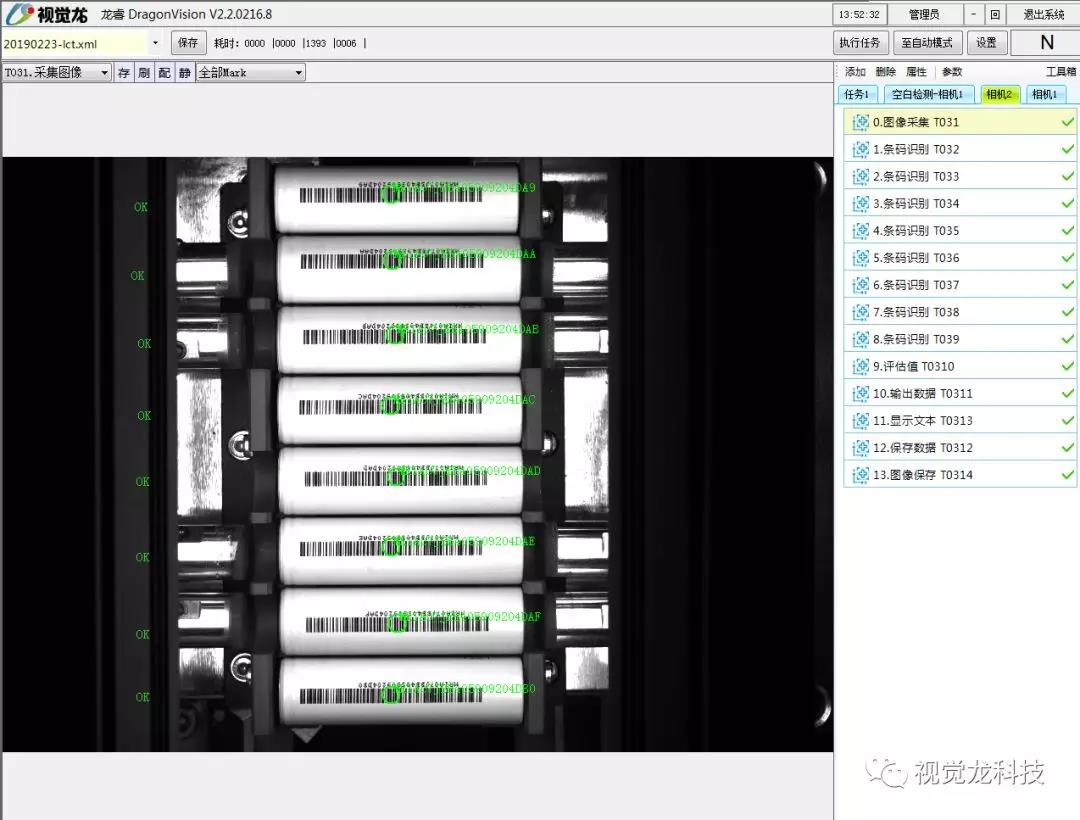 鋰電池讀碼項目說明:工位2:噴碼后讀取信息(一次讀取8個產品的條碼并且按順序或者位置輸出)。讀取8個條碼(最多可讀取50個碼)工位1:視覺檢測到字符后旋轉避開字符位置,再噴碼;如視覺檢測到來料噴碼位置有字符,輸出信號給設備旋轉電池到無字符位置進行噴碼。避開字符噴碼檢測原理: 對每個電池上的既定區域利用龍睿中的斑塊識別及面積工具,若區域內黑色斑塊面積為零或接近零→輸出ok信號→機構開始噴碼;若斑塊面積大于規定值→則NG→開啟電池旋轉→轉后給到視覺觸發信號,再繼續利用同一原理,直到全部8個電池都為ok信號后,再更換接下來8個電池。 龍睿 Dragon Vision 集成式智能相機”是一款通用型的可配置多任務的綜合視覺處理系統。包含上百鐘算法,工具即拖即用,無需編程,使用簡單。主打2D、3D、彩色應用,可支持面陣相機、線掃相機、3D相機,支持國內外各品牌機器人和支持多種通訊。