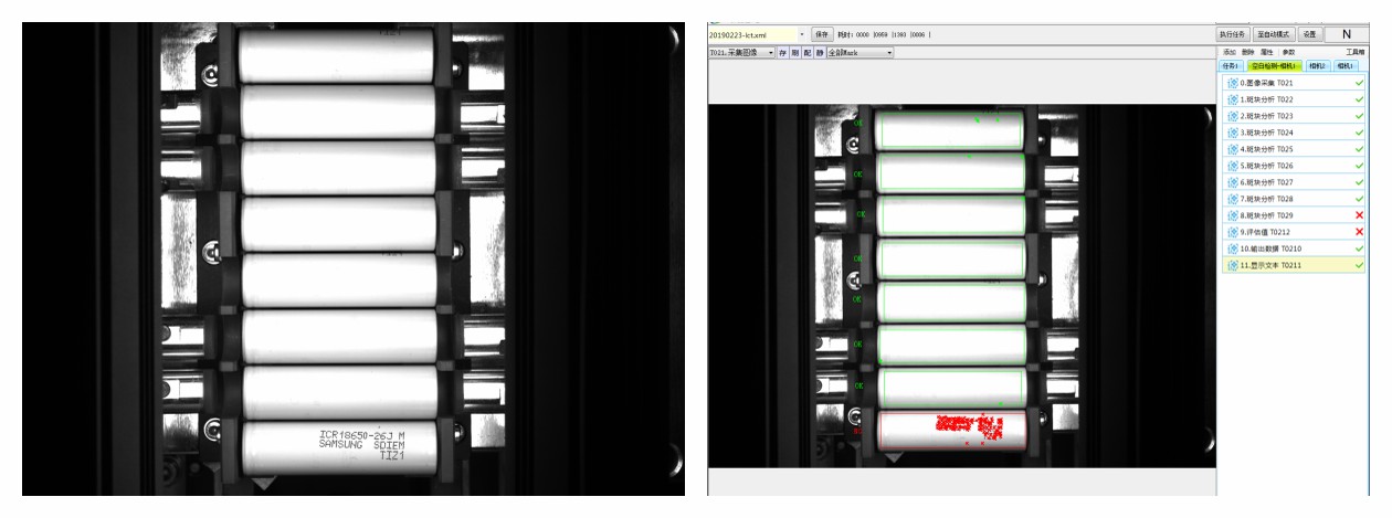 對每個電池上的既定區域利用龍睿中的斑塊識別及面積工具,若區域內黑色斑塊面積為零或接近零→輸出ok信號→機構開始噴碼;若斑塊面積大于規定值→則NG→開啟電池旋轉→轉后給到視覺觸發信號,再繼續利用同一原理,直到全部8個電池都為ok信號后,再更換接下來8個電池。